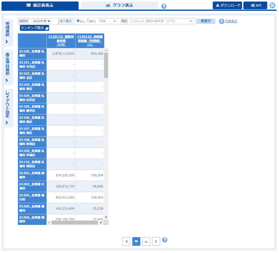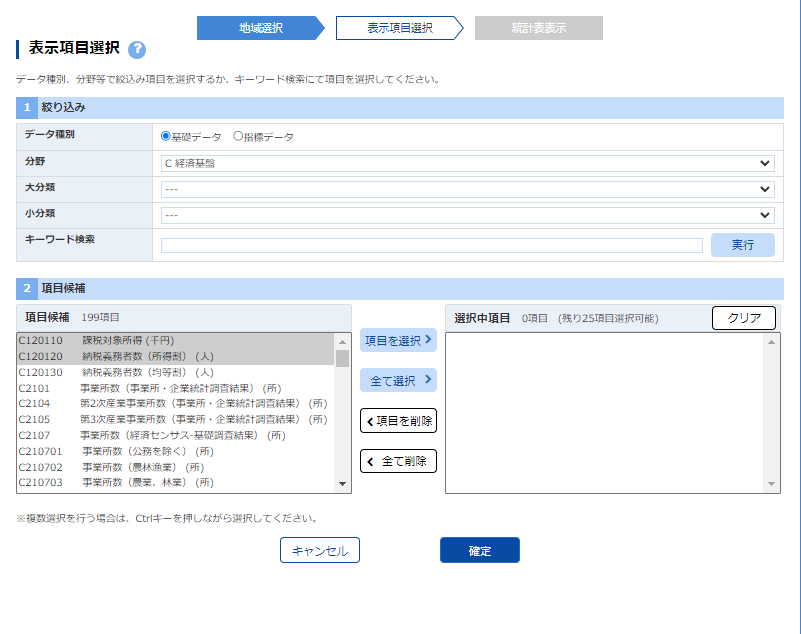 「表示項目選択」で分野を「C.経済基盤」とし,「課税対象所得(千円)」「納税義務者数(所得割)(人)」を選択する.