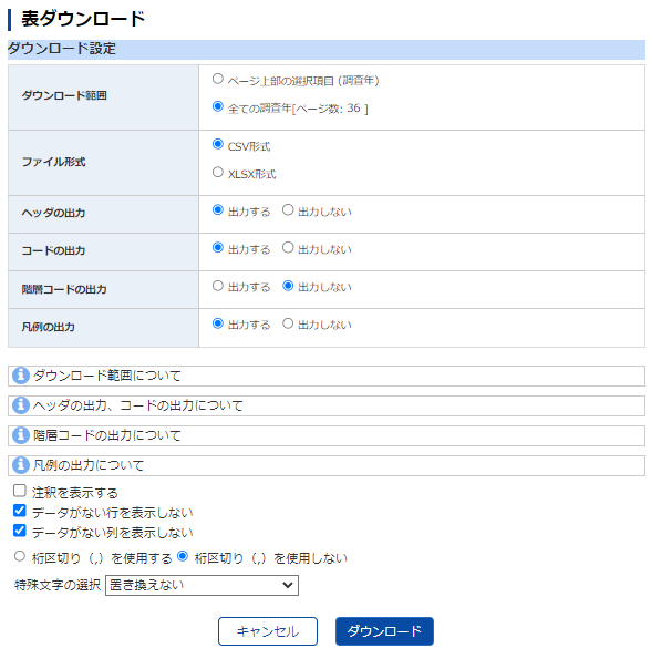 「表ダウンロード」で「注釈を表示する」「桁区切りを使用しない」に注意する.