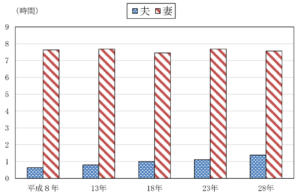 - 過去 20 年間で妻の家事時間と育児時間の合計は 7 時間 30 分でほとんど変化していない