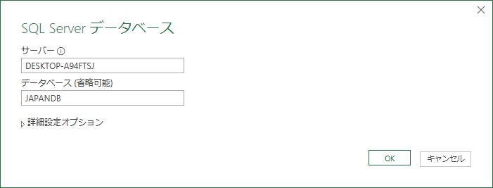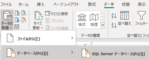 「データ」「データの取得」「データベースから」「SQL Server データベースから」と進む.