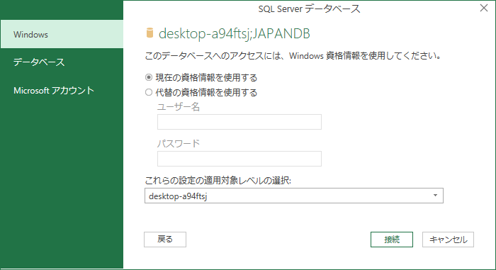 このデータベースは Windows 認証を用いているため,何も変更せずそのまま「接続」をクリックする.