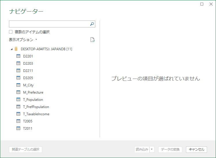 ナビゲーターの「複数のアイテムの選択」のチェックをオンにすると複数のテーブルが選択できるようになる.