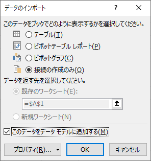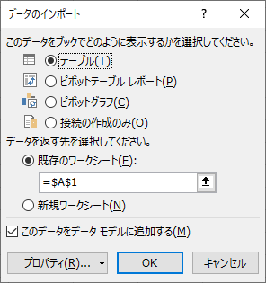 「データのインポート」ダイアログで「テーブル」にチェックを付ける.