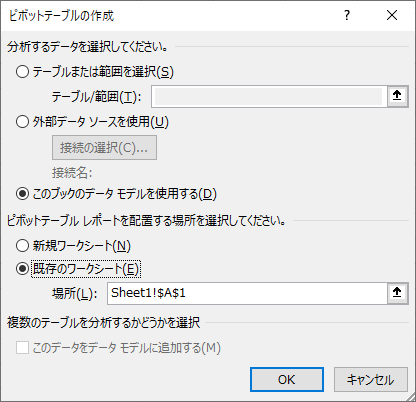 「ピボットテーブルの作成」で「このブックのデータモデルを使用する」にチェックが入っている.そのまま OK をクリックする.