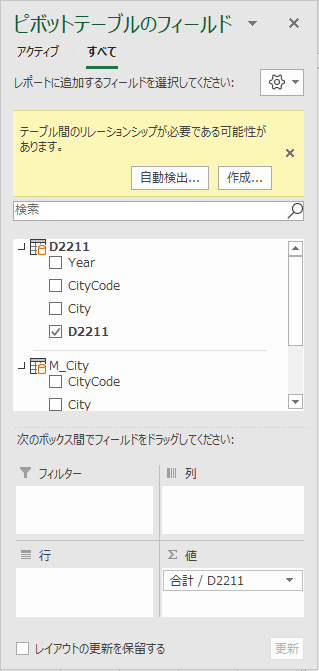 メジャーである D2211 というフィールドには数値型のデータが入っているのだが,このフィールドを「Σ値」のボックスにドロップすると EXCEL が自動的に警告を出してくる.