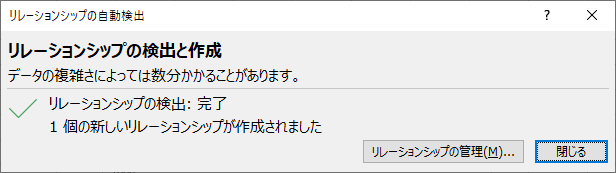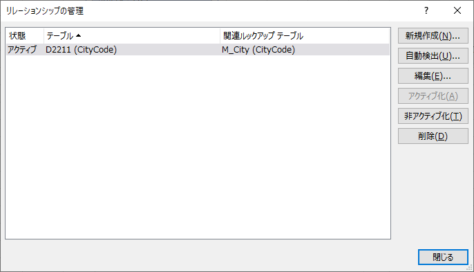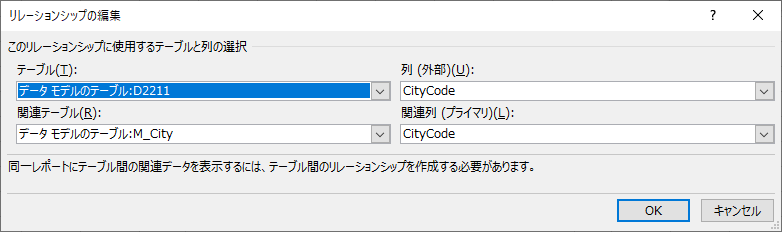 「このリレーションシップに使用するテーブルと列の選択」と長い説明があるが,要はテーブル間の結合キーを示している.