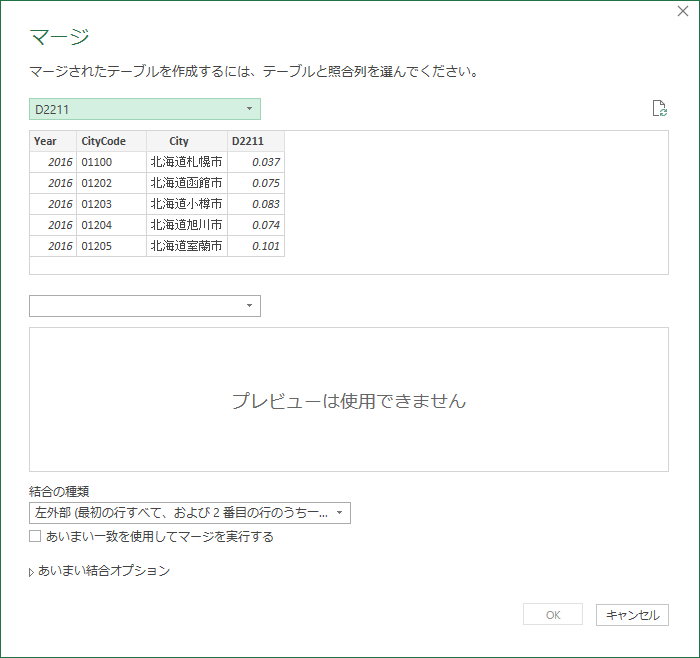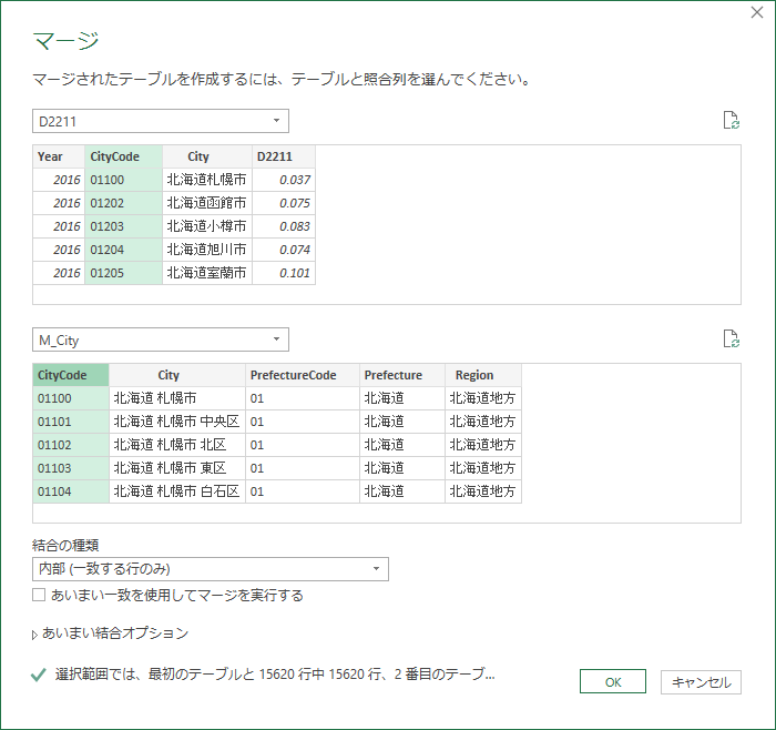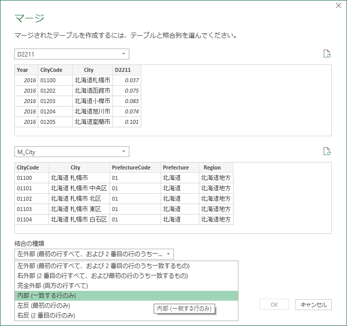 ソース = Table.NestedJoin(D2211, {"CityCode"}, M_City, {"CityCode"}, "M_City", JoinKind.Inner),