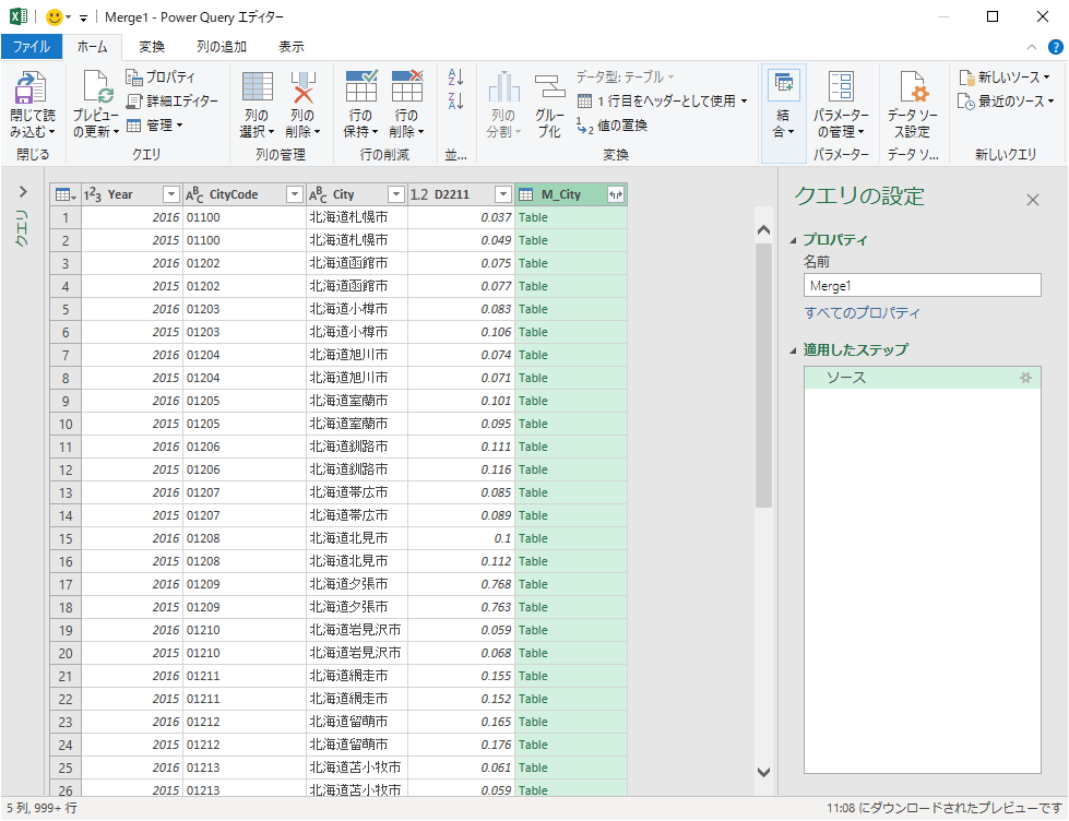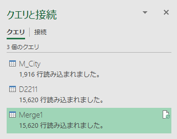 「クエリと接続」では新しく Merge1 という名のクエリが出来ている.