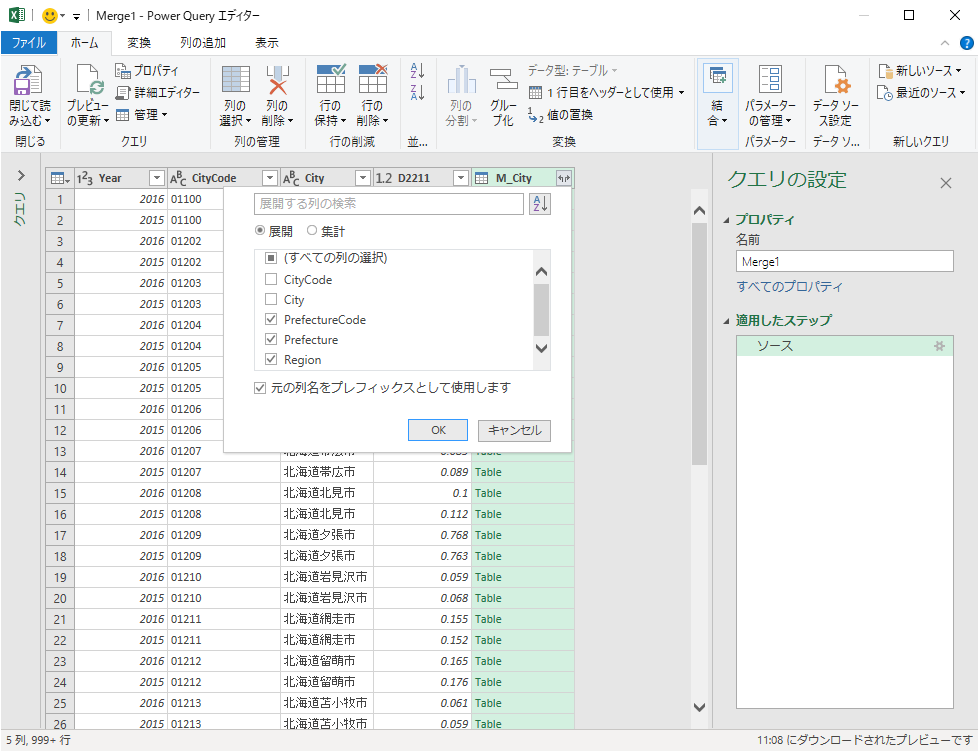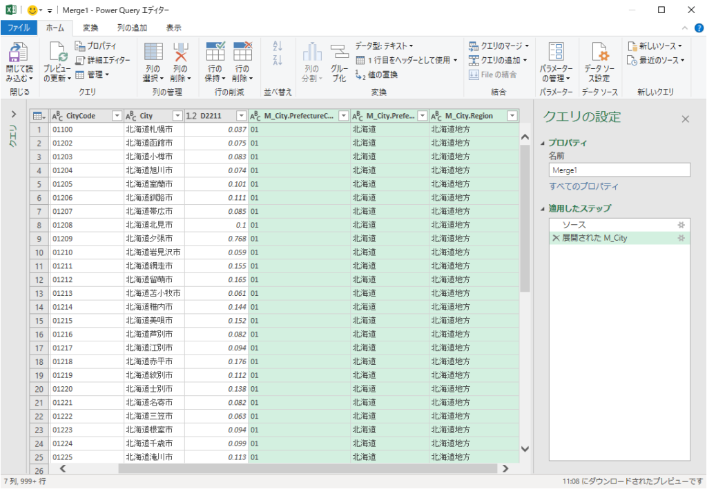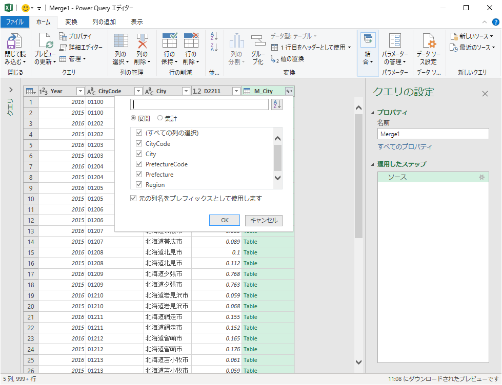 #"展開された M_City" = Table.ExpandTableColumn(ソース, "M_City", {"PrefectureCode", "Prefecture", "Region"}, {"M_City.PrefectureCode", "M_City.Prefecture", "M_City.Region"})
