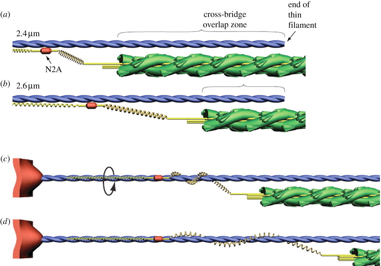 しかし実はこの ‘winding filament’ 仮説は,最新の研究で否定されつつあるように見える.原子間力顕微鏡および磁気ピンセットによる研究ではタイチン分子の折りたたみが関わる,いわゆる titin folding 仮説 が優勢である.この分野はホットな領域であり,今後の研究が待たれる.