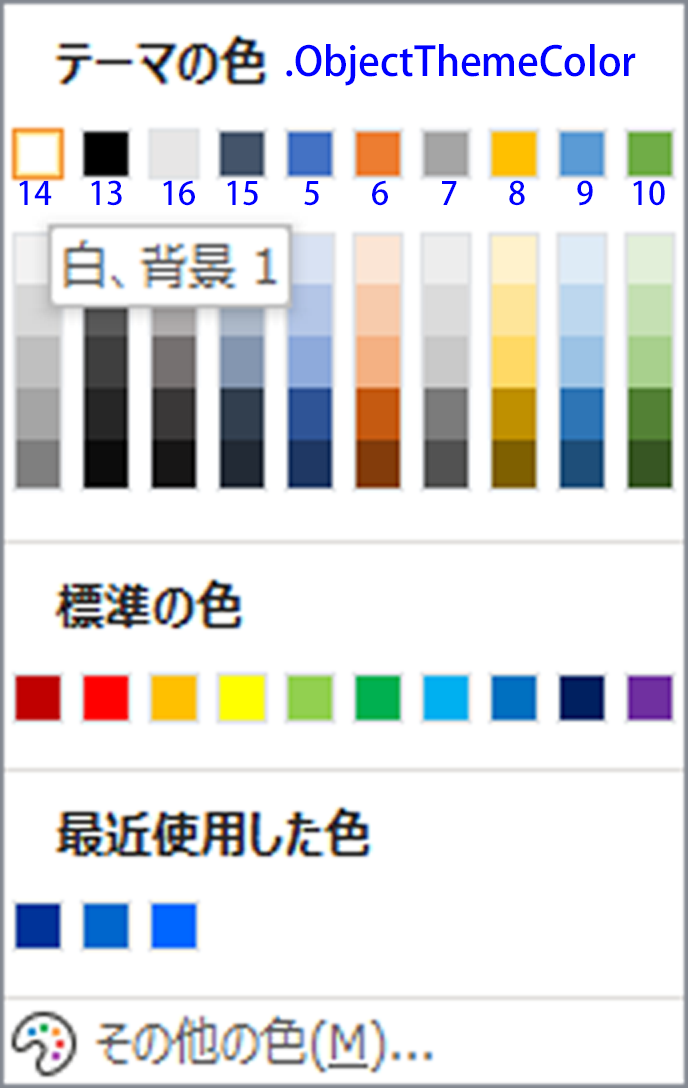 本記事はVBA から見た EXCEL の散布図の点と線で述べた ObjectThemeColor プロパティと関連している.さらに詳細は Office テーマの色空間を探索するで述べている.