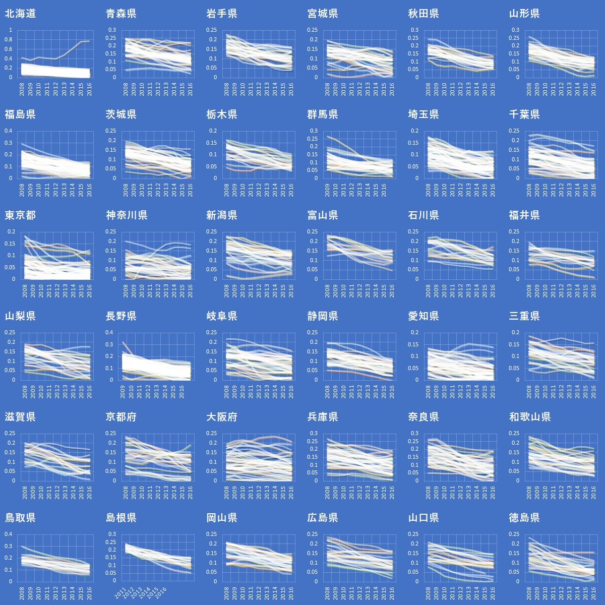 EXCEL VBAで複数の散布図を敷き詰めて並べるでは散布図を都道府県の数だけ敷き詰めて並べた.今回はその散布図一つ一つにデータ系列を追加する.