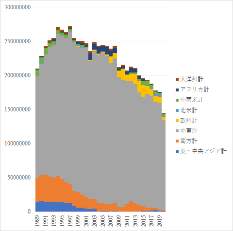 原油の地域別,国別輸入元の推移をグラフ化するでは日本が輸入している原油の輸入元を1989年から2020年まで地域別,国別に概観した.今回は全世界の石油生産量の推移を地域別に概観する.