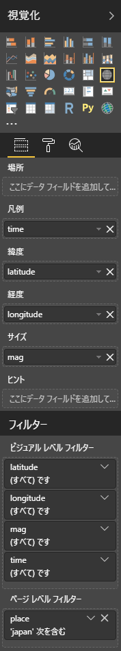 「視覚化」で「マップ」,「凡例」にそれぞれの項目を指定し「高度なフィルター処理」で「指定の値を含む」に japan を指定する.