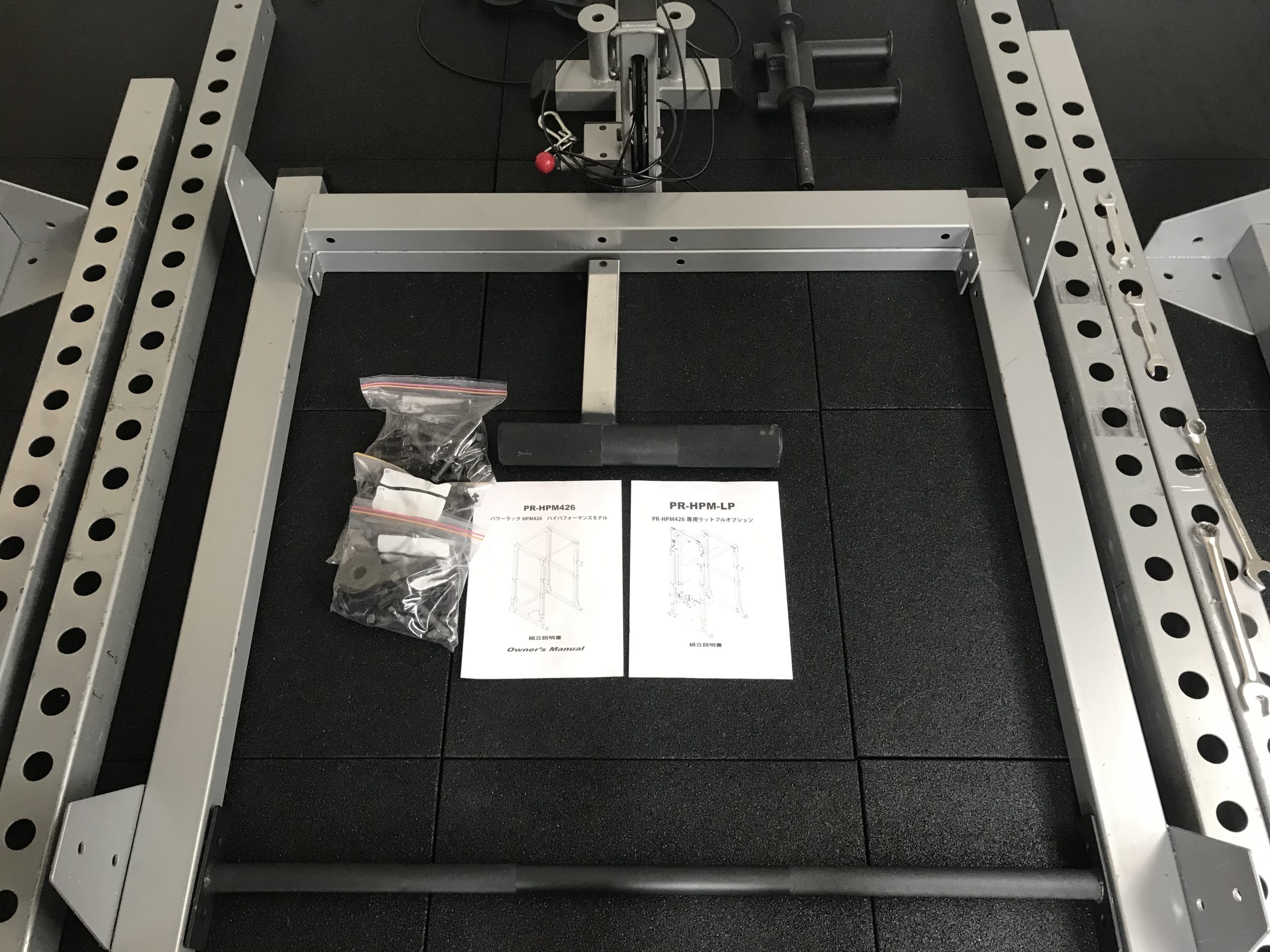 ラットプルプションはパワーラック本体が組み上がってから組み付ける.正面の床フレームにラットプルオプションの十字フレームを組み付ける.次にプレートユニットを通すアルミニウムのシャフトを 2 本立て,プレートユニットを通す.さらに頭上のフレームをシャフトに通しつつ,パワーラック本体の頭上ユニットに組み付ける.