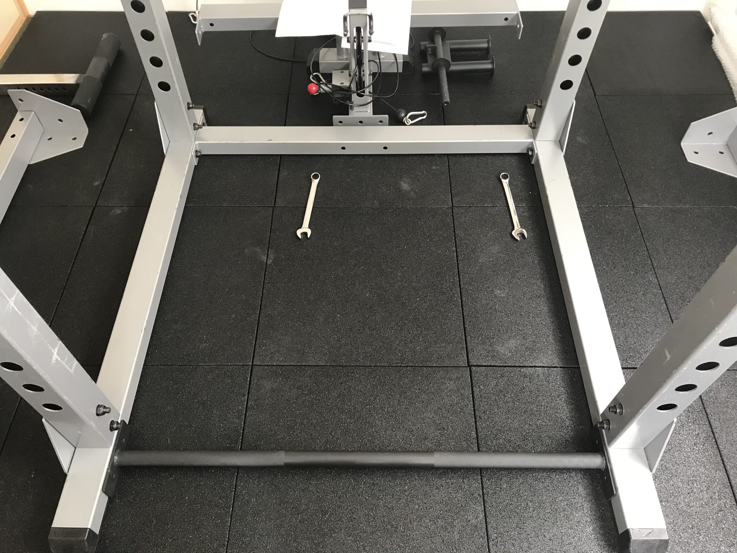 組み立てはボルトとナットを締め付けることで行う.写真にスパナが写っているが,同じ大きさのスパナが 2 本必要だ.最初にラットプルオプションに接する正面のフレームに対して,左右のフレームを固定するところから始まる.
