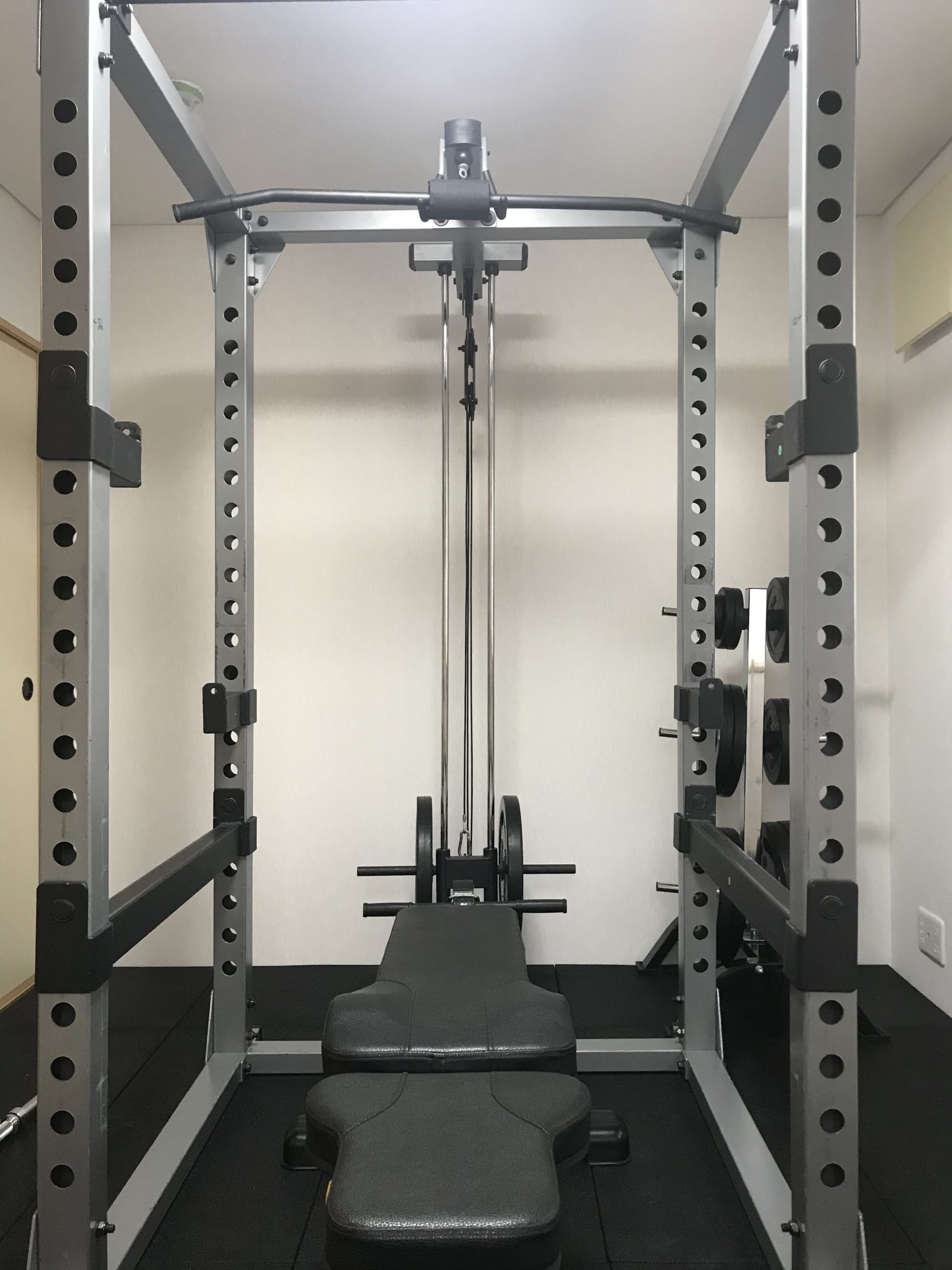 ということで,パワーラックは部屋の長軸に沿ってベンチを配置する格好になる.実際,ラットプルオプションを追加しており,こういう配置でないと収まらない…というところまでを頭の中でシミュレートする.