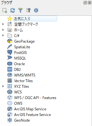 QGISのブラウザが左側中央に表示されている.おそらく空間データの資源を表示しているのだと思う.