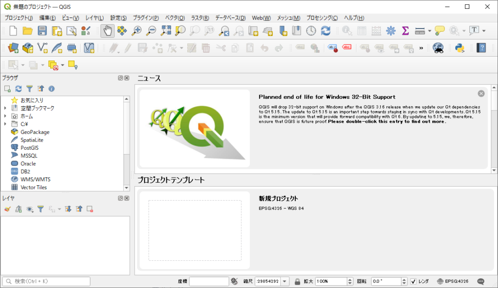 無題のプロジェクト-QGISという名前でウィンドウが開く.上端はメニュー関係,左側のパネルはブラウザとレイヤ,中央から右にかけての最も広い面積のマップキャンバスが作業部分であろう.