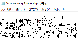 しかし,直接シェープファイルをテキストエディタで開くと文字化けする.化けた文字列を直接貼り付けるとこの投稿自体の表示がおかしくなるため,画像で貼り付ける.