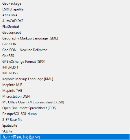 一番上にある「形式」をプレスするとファイル形式が列挙されるので,一番下の「カンマで区切られた値[CSV]」を選ぶ.