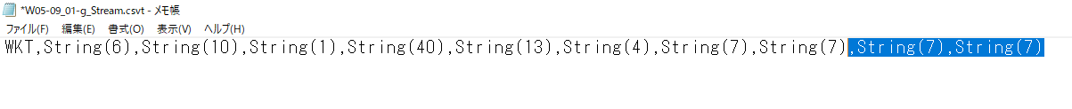 次は CSVT ファイルの編集である.メモ帳で W05-09_01-g_Stream.csvt という名前のファイルを開く.5 番目と 6 番目のデータ型定義を選択する.