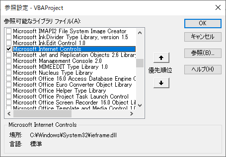 「参照可能なライブラリファイル」一覧を下へスクロールして Microsoft Internet Controls を見つけ,チェックを入れて OK ボタンをクリックする.