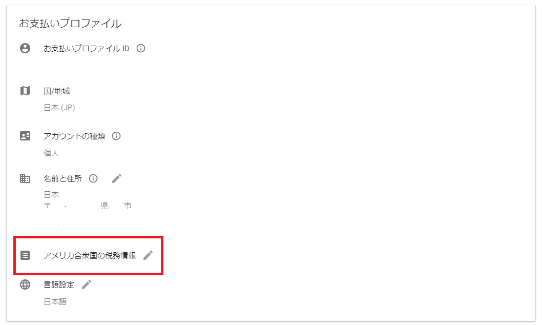 この後「送信」をクリックすると完了となる.下図のように「米国の税務情報」が入力された状態となっているはずだ.GMail に確認メールが届いているはずである.