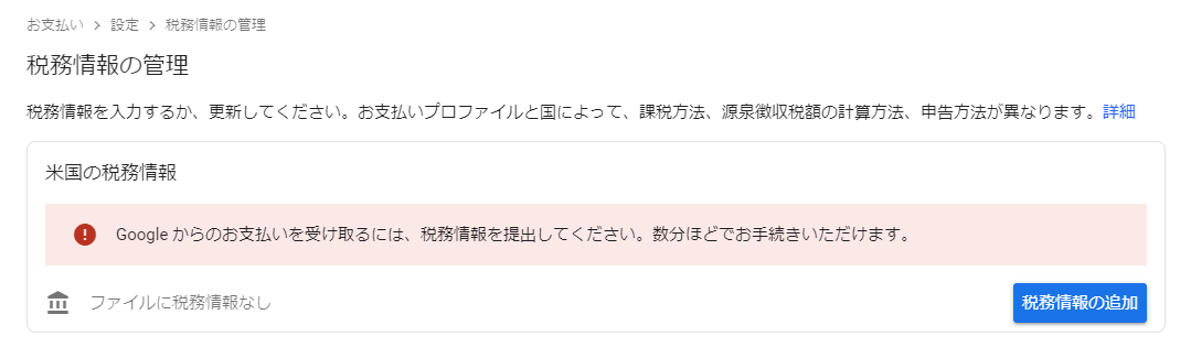 すでに一度支払いを受けているので「過去にお支払いを受け取ったことがあるお支払いプロファイルの税務情報を提出します」を選ぶ.まだ一度も支払いを受けていないならそちらをチェックする.