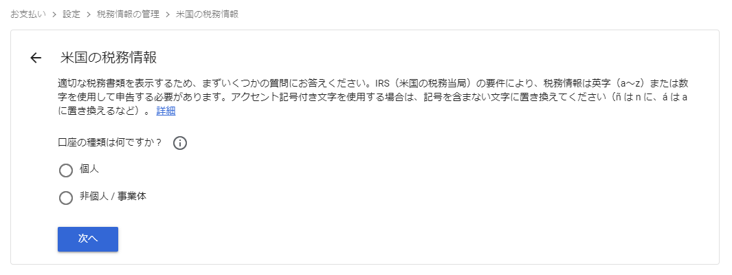 ここは重要である.「納税者番号セクションに記されている個人または事業体は,これまでに米国内で Google を対象にした活動やサービスを行ったことがありますか?」には必ず「はい」をチェックすること.理由は赤丸で示した情報をクリックすると分かる.