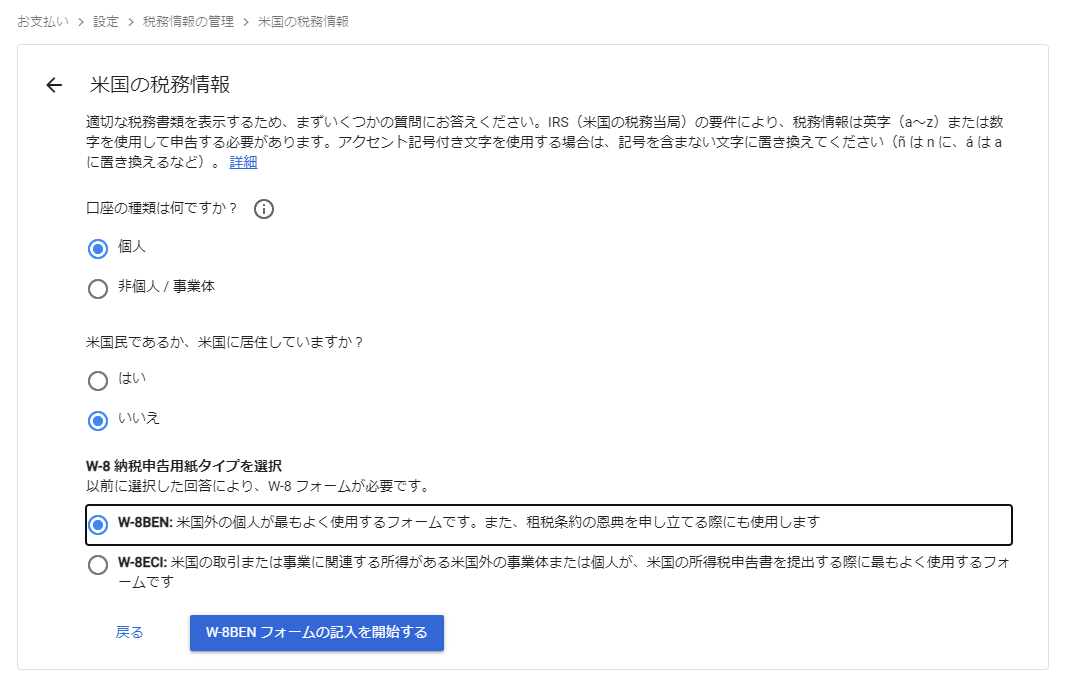 すると次の質問に遷移する.「米国民であるか,米国に居住していますか?」には「いいえ」,「W-8 納税申告用紙タイプを選択」では「W-8BEN」をチェックする.「W-8BEN フォームの記入を開始する」ボタンをクリックする.