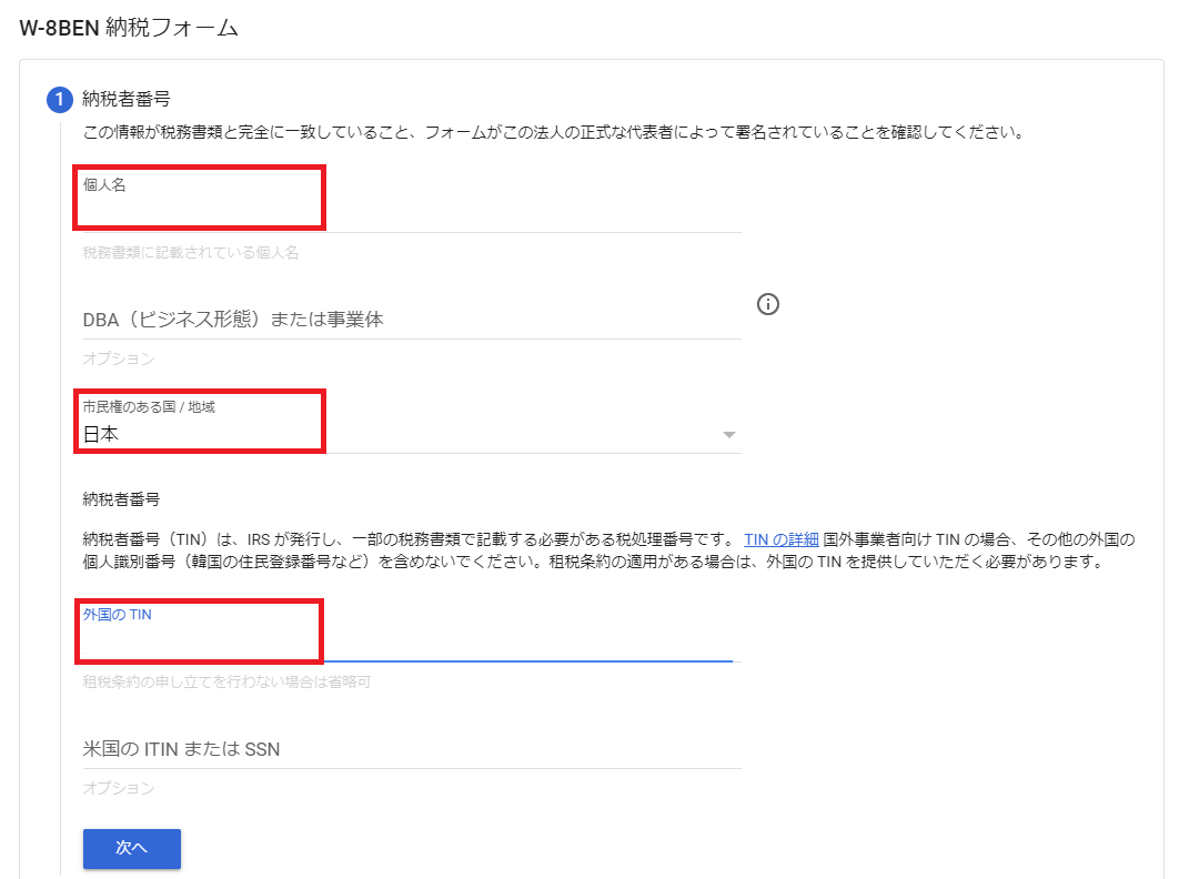 W-8BEN 納税フォームに個人名,市民権のある国/地域,納税者番号(外国の TIN)を入力する.納税者番号とは日本ではマイナンバーのことである.それぞれタイプし,リストから選択し,タイプする.