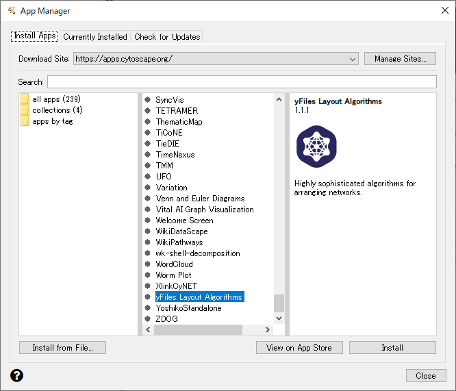 中段を下にスクロールしていくと yFiles Layout Algorithms が見つかるのでクリックして選択し Install ボタンをクリックする.