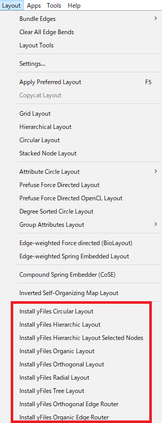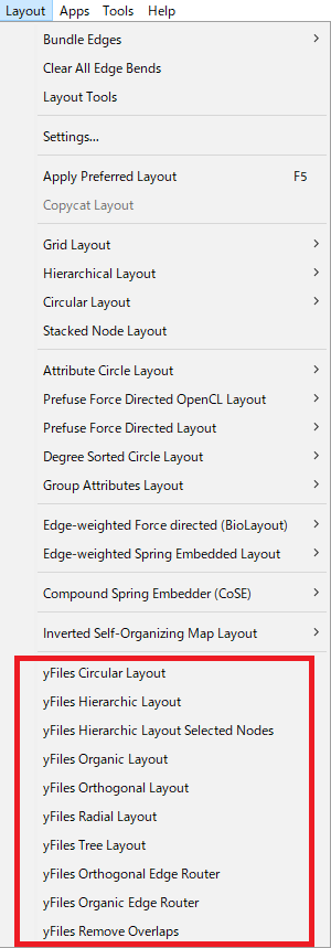 インストール後の Layout メニュー.yFiles Layout Algorithms が使用できるようになっている.