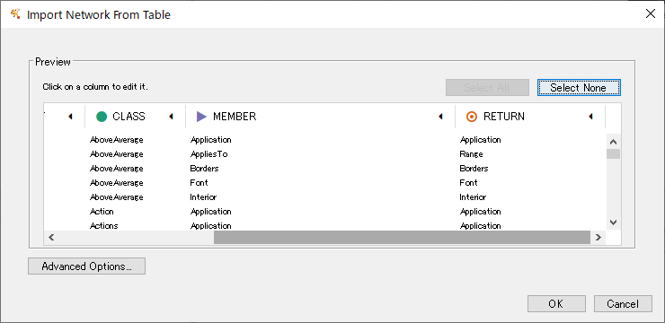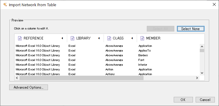 手元にオブジェクトブラウザーの一覧がある.クラス,メンバー,戻り値の3列に参照設定のファイル名およびライブラリ名の 2 列を加えた 5 列からなるテーブルである.これを可視化してみたい.特にオブジェクト間の関係を可視化したい.