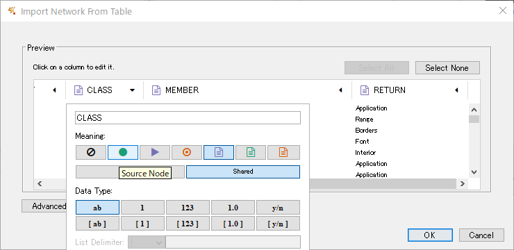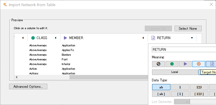 オブジェクトブラウザーでのクラスを Source Node と指定し,戻り値を Target Node と指定することで有向グラフとなる.