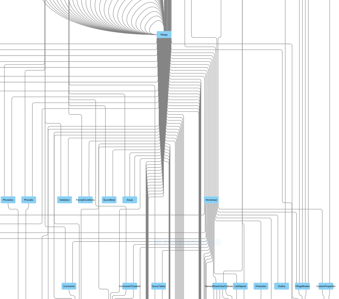 中段の右寄りにある.様々なオブジェクトからエッジが集中しており,Range オブジェクト自体へもエッジが出力している.ちなみに上段の中央でエッジの集中しているのは Application オブジェクトである.