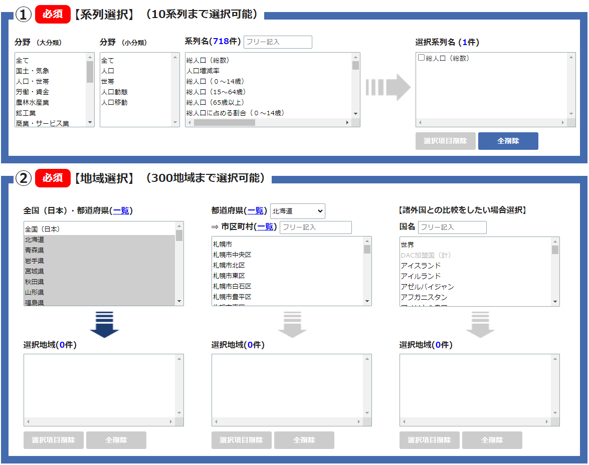 系列選択は分野(大分類)から「人口・世帯」を選択し,系列名から「総人口(総数)」を選択する.