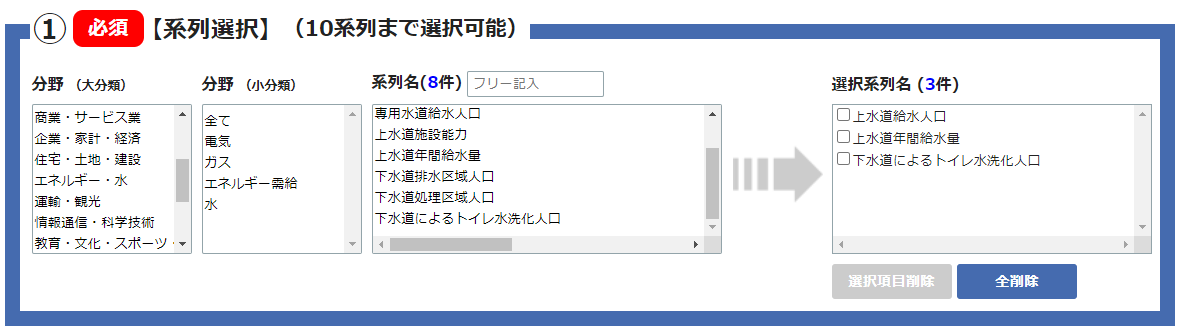 系列選択の分野(大分類)から「エネルギー・水」を選択すると分野(小分類)が絞り込まれる.ここから「水」を選択すると系列が絞り込まれる.ここで「上水道給水人口」,「上水道年間給水量」,「下水道によるトイレ水洗化人口」を選択する.