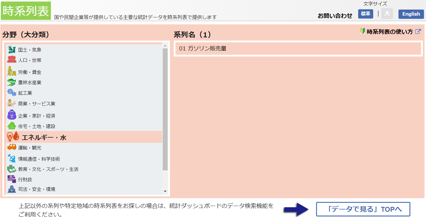 時系列表のエネルギー・水を選択しても「ガソリン販売量」しか表示されない.画面下部にある「データで見るTOPへ」をクリックすると,「統計ダッシュボード データ検索画面」に遷移する.
