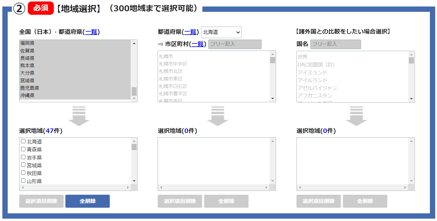 上記の系列を選択した時点で地域選択の粒度が決まる.選択できない項目はグレーアウトする.水に関しては都道府県単位の選択粒度である.北海道から沖縄まで選択する.