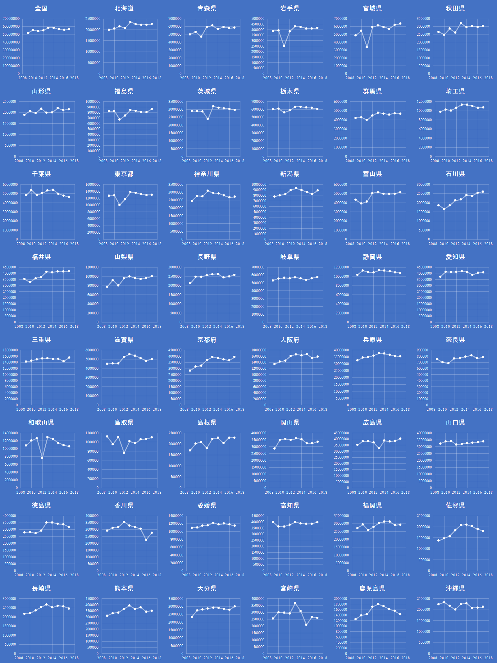eStatから日本の資源収支を概略するでは日本全体として温室効果ガス算定排出量が増加傾向にあることを述べた.今回は都道府県ごとの温室効果ガス算定排出量の推移をグラフ化する.