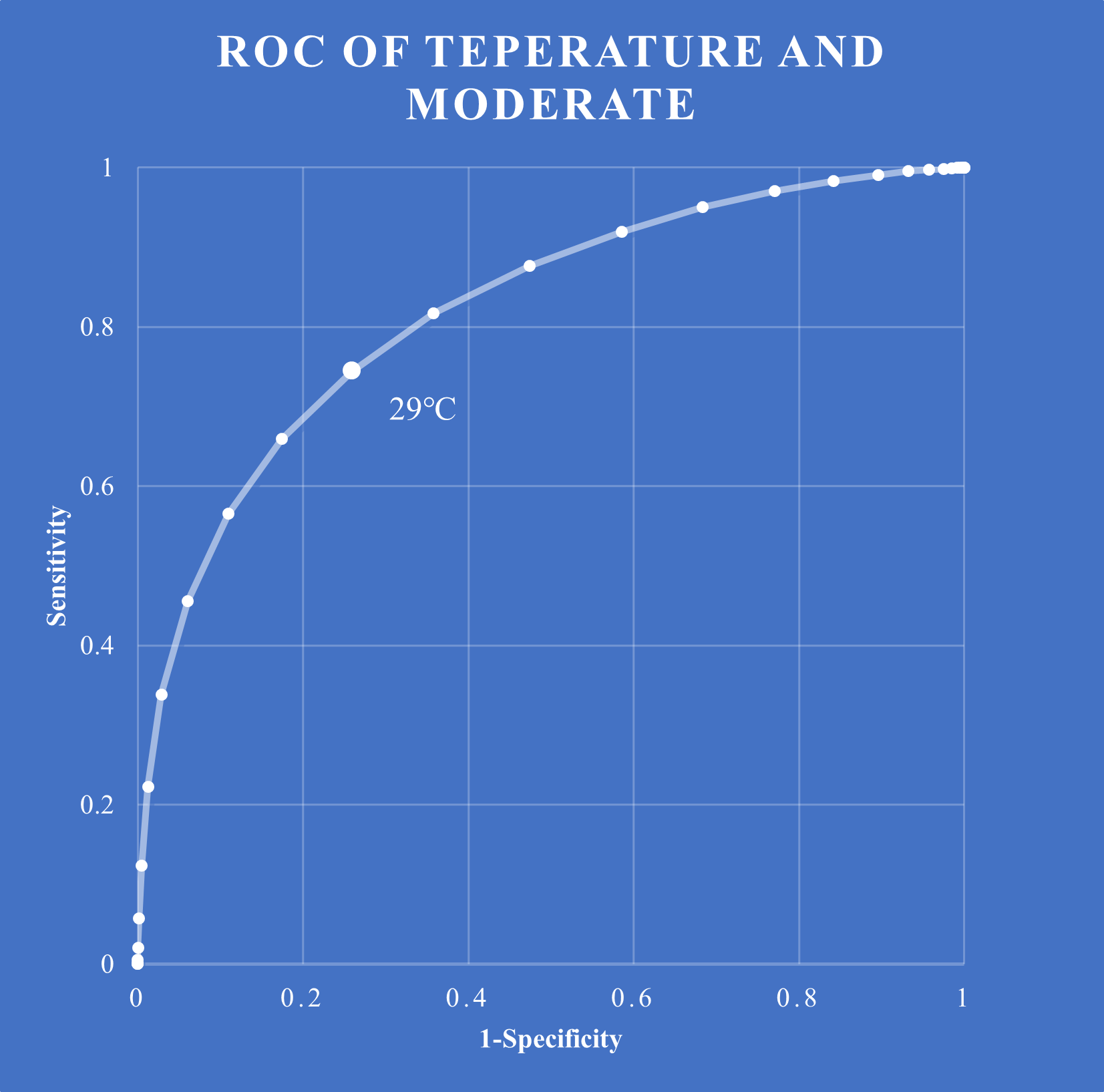 中等症における閾値は29℃,感度は0.74, 特異度は0.74であった.