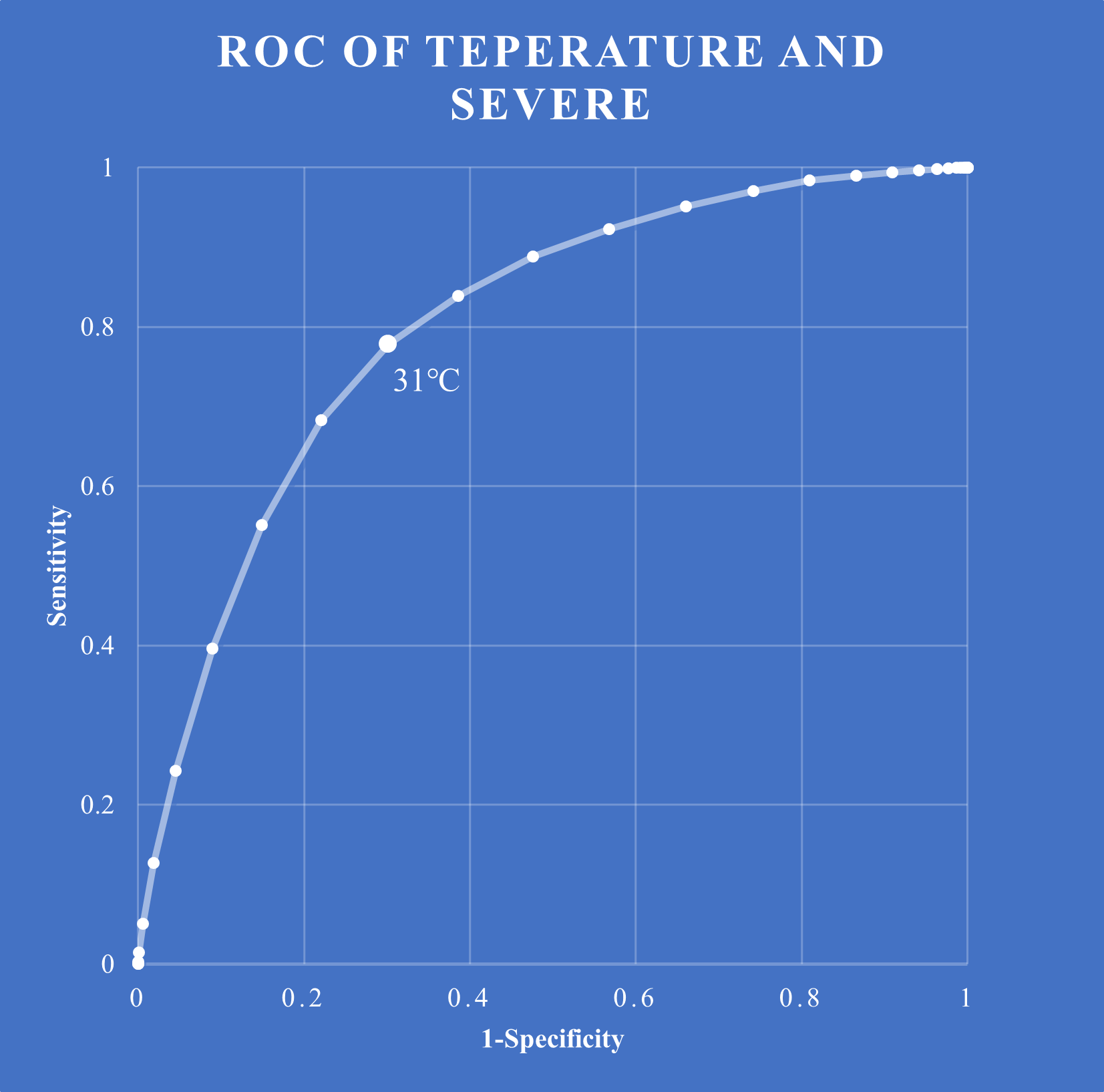 重症における閾値は31℃,感度は0.78特異度は0.70であった.