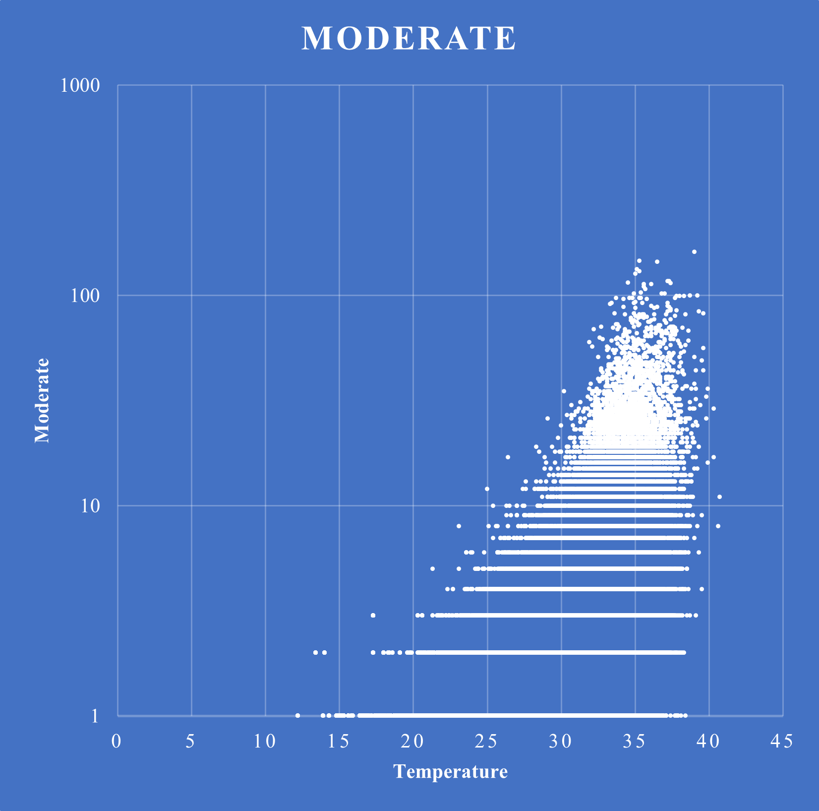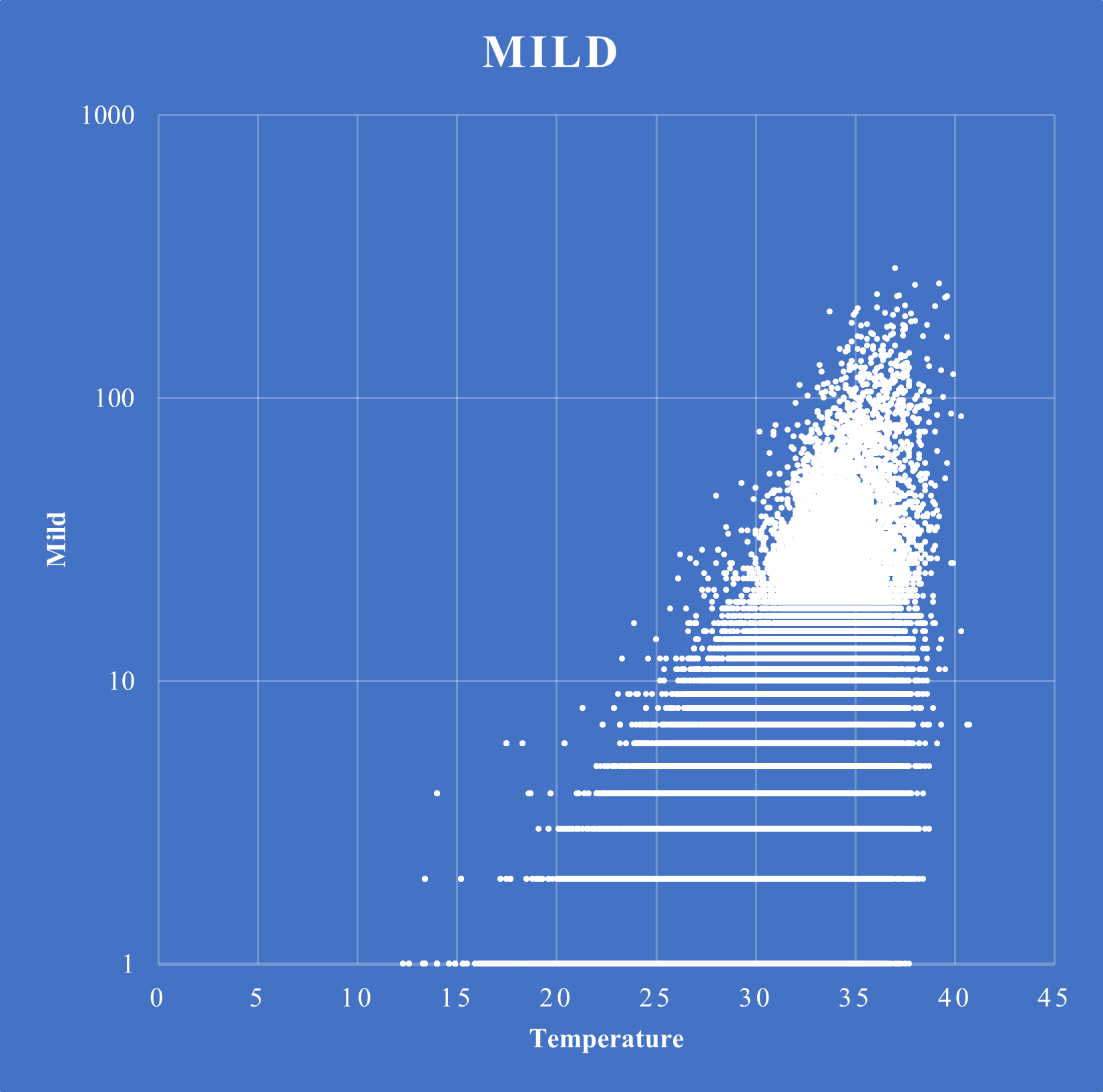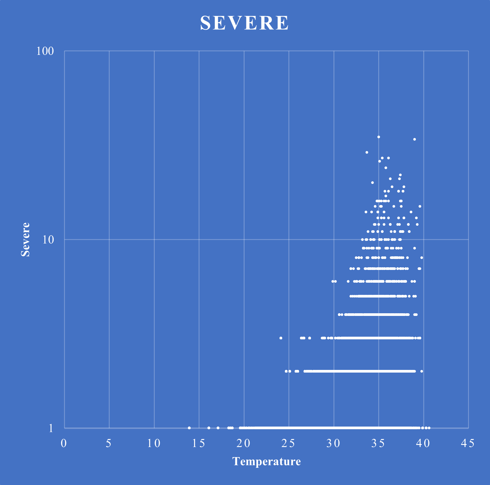 日別平均水蒸気圧と同様,日最高気温が上昇するにつれてどの重症度も搬送人員数が指数関数的に増加する傾向にある.今回は縦軸を対数とした.片対数グラフに直線が現れた場合は自己組織化が起きている.この場合,ある一定以上の外気温に人体は耐えられないという限界を示しているものと考えられる.