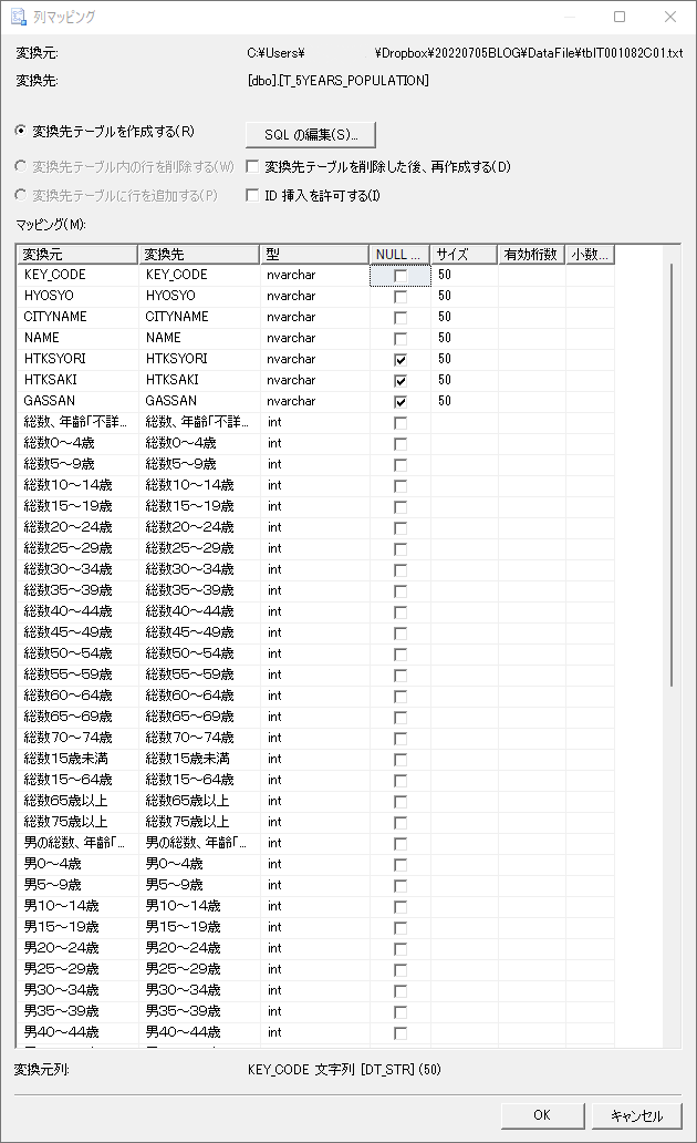 SQL Serverの任意のデータベースを右クリックして「タスク」「データのインポート…」と進み,ウィザードを起動する.下図は「マッピングの編集」画面でデータ型とデータ長を指定し終わったところである.
