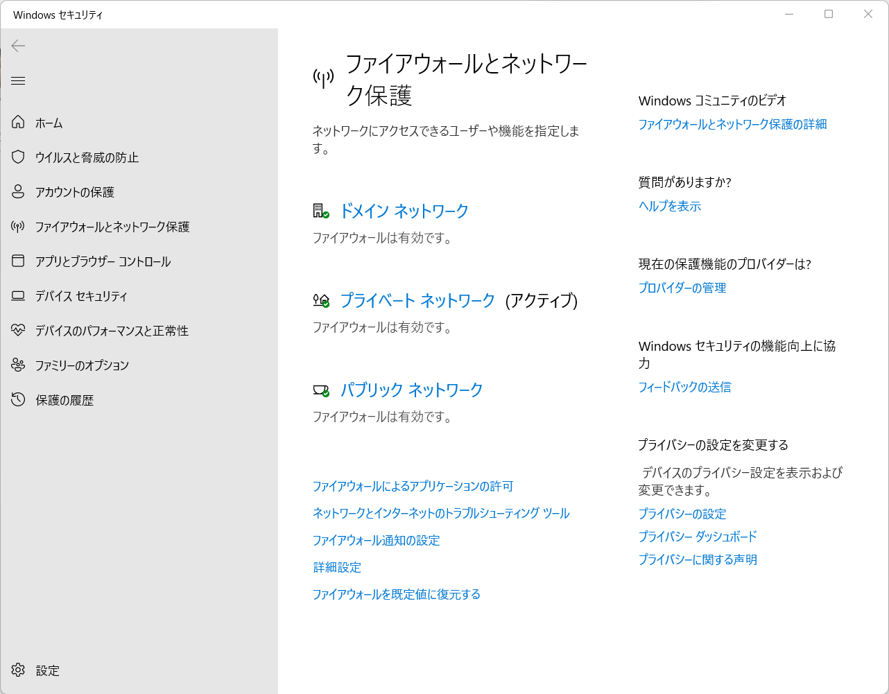 「ファイアウォールとネットワークの保護」の設定画面が開く.「ファイヤーウォールによるアプリケーションの許可」をクリックする.
