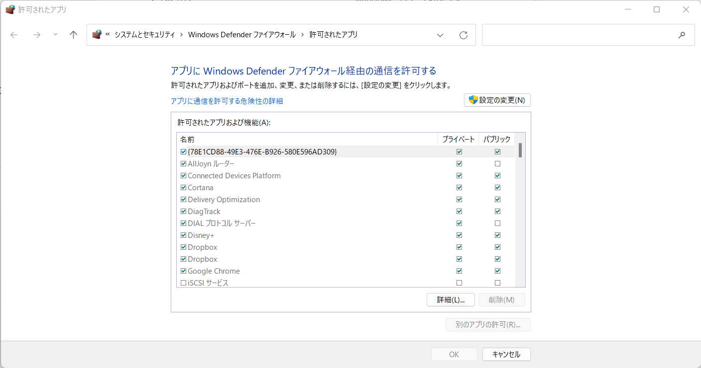「許可されたアプリおよび機能」ウィンドウが開く.右上の「設定の変更」をクリックし,右下の「別のアプリの許可」ボタンをクリックする.