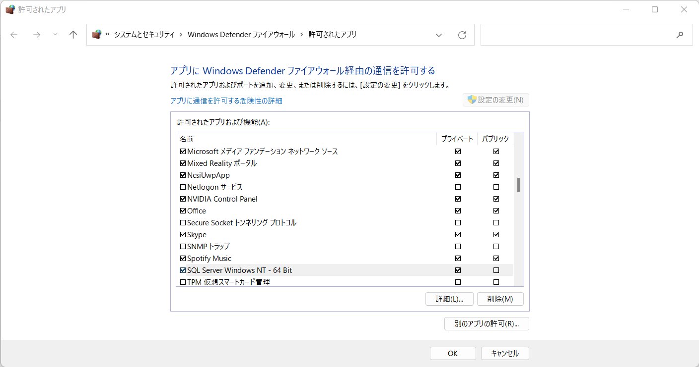 「許可されたアプリおよび機能」にSQL Serverが追加されている.