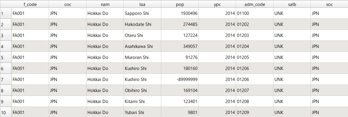 行政界の属性テーブルが開く.f_code, coc, nam, laa, pop, ypc, adm_code, salb, soc と9つの属性が表示される.都道府県が表示されているのはnamの列である.cocは国コード, adm_codeは地方公共団体コードのことだろう.他はわからない.